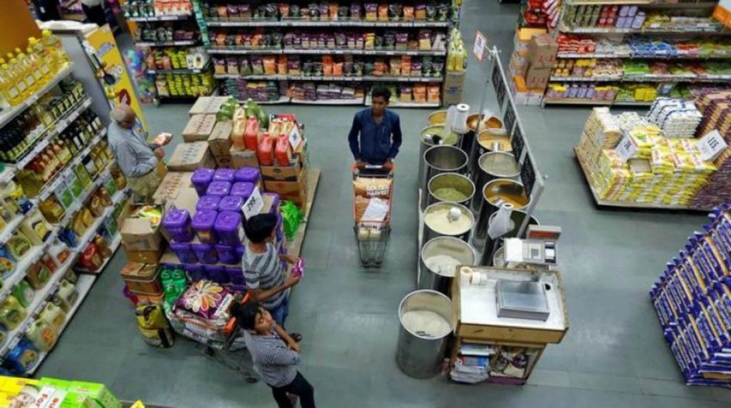 Young woman wearing protective mask and buying food in grocery store during coronavirus pandemic.